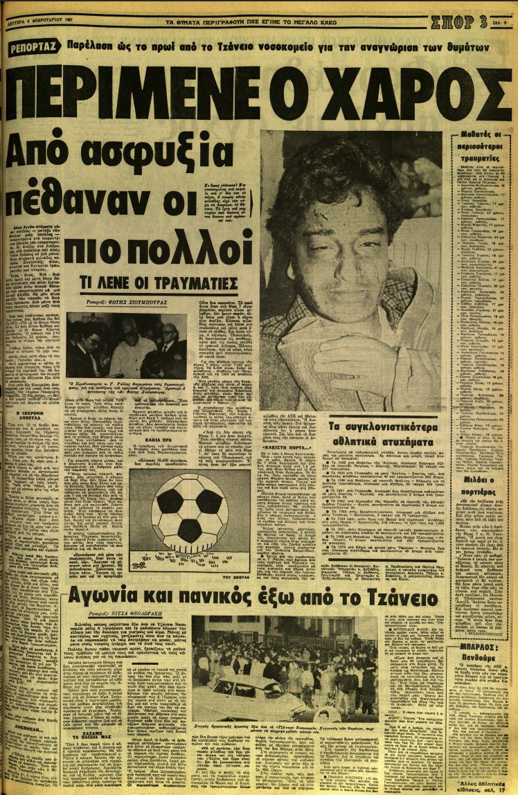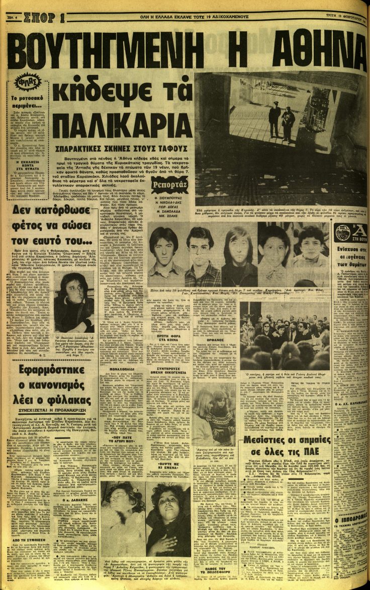 Η «Απογευματινή» πάντα στην πρώτη γραμμή των γεγονότων κάλυψε με εκτεταμένα ρεπορτάζ τη μεγαλύτερη τραγωδία που έχει βιώσει ο ελληνικός αθλητισμός. «Τραγωδία με 19 νεκρούς και 59 τραυματίες» ήταν ο κεντρικός τίτλος της εφημερίδας ενώ τονιζόταν ότι είχε κηρυχθεί εθνικό πένθος. Παράλληλα στις εσωτερικές σελίδες υπήρχε εκτενές ρεπορτάζ για όλα όσα είχαν διαδραματιστεί στο φαληρικό γήπεδο αλλά και στο Τζάννειο νοσοκομείο. Ομοίως και στις 10 Φεβρουαρίου η «Απογευματινή» αναφερόταν στην τραγωδία. «Παγίδα θανάτου η Θύρα 7» ήταν ο κεντρικός τίτλος της εφημερίδας, ενώ τονιζόταν ο θρήνος που είχε σκεπάσει τις κηδείες των θυμάτων.