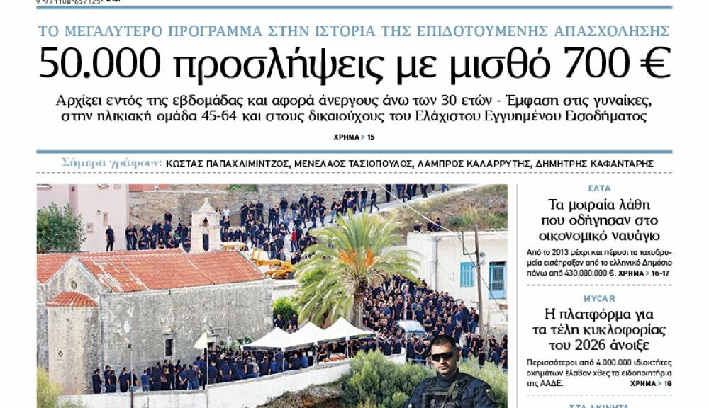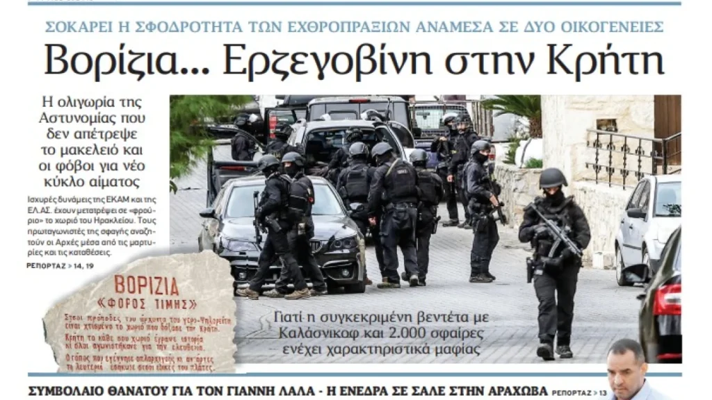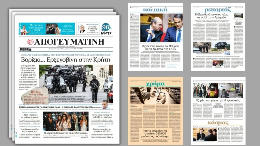Πρωτοσέλιδα Εφημερίδας Διαβάστε στην Απογευματινή: Βορίζια… Ερζεγοβίνη στην Κρήτη – Σοκάρει η σφοδρότητα των εχθροπραξιών ανάμεσα σε δύο οικογένειες Πλούσιο ρεπορτάζ στην Απογευματινή που κυκλοφορεί 08:12 - 3 Νοεμβρίου 2025