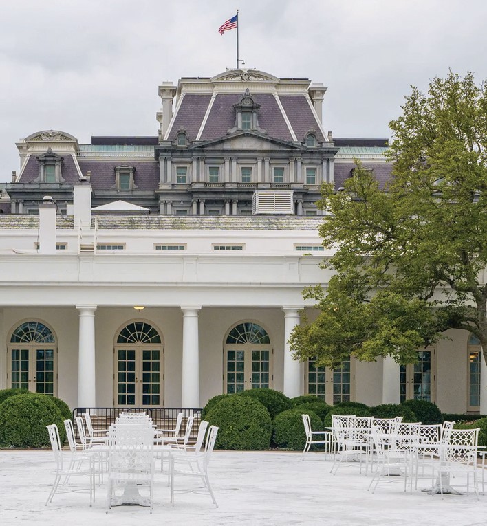Το είδος της αναβάθµισης, που οι κυνικοί θα έλεγαν ότι δεν θα ήταν άσχετο µε µια αλυσίδα πολυτελών ξενοδοχείων του Ντουµπάι, συνεχίζεται και στους εξωτερικούς χώρους. Ο Rose Garden, που δηµιουργήθηκε κατά τη διάρκεια της διακυβέρνησης του Τζον Κένεντι, χρησιµοποιείται παραδοσιακά για οποιαδήποτε περίσταση, από σηµαντικές δηµόσιες ανακοινώσεις µέχρι την τελετή απονοµής χάριτος για τη γαλοπούλα των Ευχαριστιών. Ο Τραµπ έχει ξηλώσει το γκαζόν του Rose Garden -όπου ο πρόεδρος Ρόναλντ Ρίγκαν είχε φωτογραφηθεί ως γνωστόν να βγάζει βόλτα τον σκύλο του µε τη Μάργκαρετ Θάτσερ- λέγοντας ότι είναι πάντα υγρό και άβολο για τις γυναίκες που φορούν ψηλά τακούνια. «Το γρασίδι απλά δεν εξυπηρετεί», παραπονέθηκε. Ετσι, το γρασίδι έφυγε και το τσιµέντο ήρθε, όπου υπάρχει τώρα µια λευκή µαρµάρινη αυλή στολισµένη µε γιγαντιαίες οµπρέλες που έφερε από το Μαρ-α-Λάγκο για να σκιάζει τα υπαίθρια τραπέζια και τις καρέκλες.