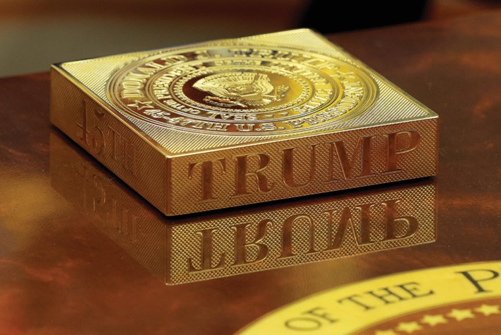 Οπως και στις άλλες οικίες του, το πνεύµα είναι πολύ κοντά στο παλάτι των Βερσαλιών του Λουδοβίκου Ι∆’. Και για τον νέο «βασιλιά», καµία λεπτοµέρεια δεν είναι πολύ µικρή για µια δόση λάµψης. Χρυσά σουβέρ µε το όνοµα του Τραµπ κοσµούν τα τραπεζάκια, ενώ ακόµη και το κουµπί που πατάει για να παραγγείλει το αγαπηµένο του ποτό, την Κόκα Κόλα διαίτης, είναι πλέον χρυσό και βρίσκεται στην επιφάνεια εργασίας σε ένα ξύλινο κουτί που φέρει την προεδρική σφραγίδα (ο Τραµπ λατρεύει να αστειεύεται ότι ο κόσµος υποθέτει ότι πρόκειται για το κουµπί εκτόξευσης πυρηνικών πυραύλων). Ηθελε επίσης έναν τεράστιο πολυέλαιο στο Οβάλ Γραφείο, αλλά του είπαν ότι το ταβάνι δεν θα το άντεχε.