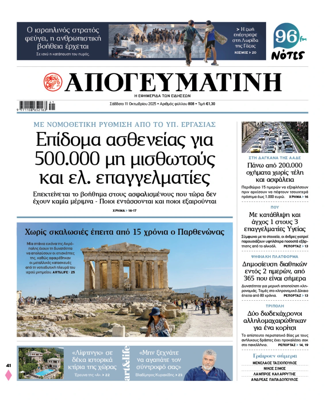 Διαβάστε στην Απογευματινή: Επίδομα ασθενείας για 500.000 μη μισθωτούς και ελ. Επαγγελματίες