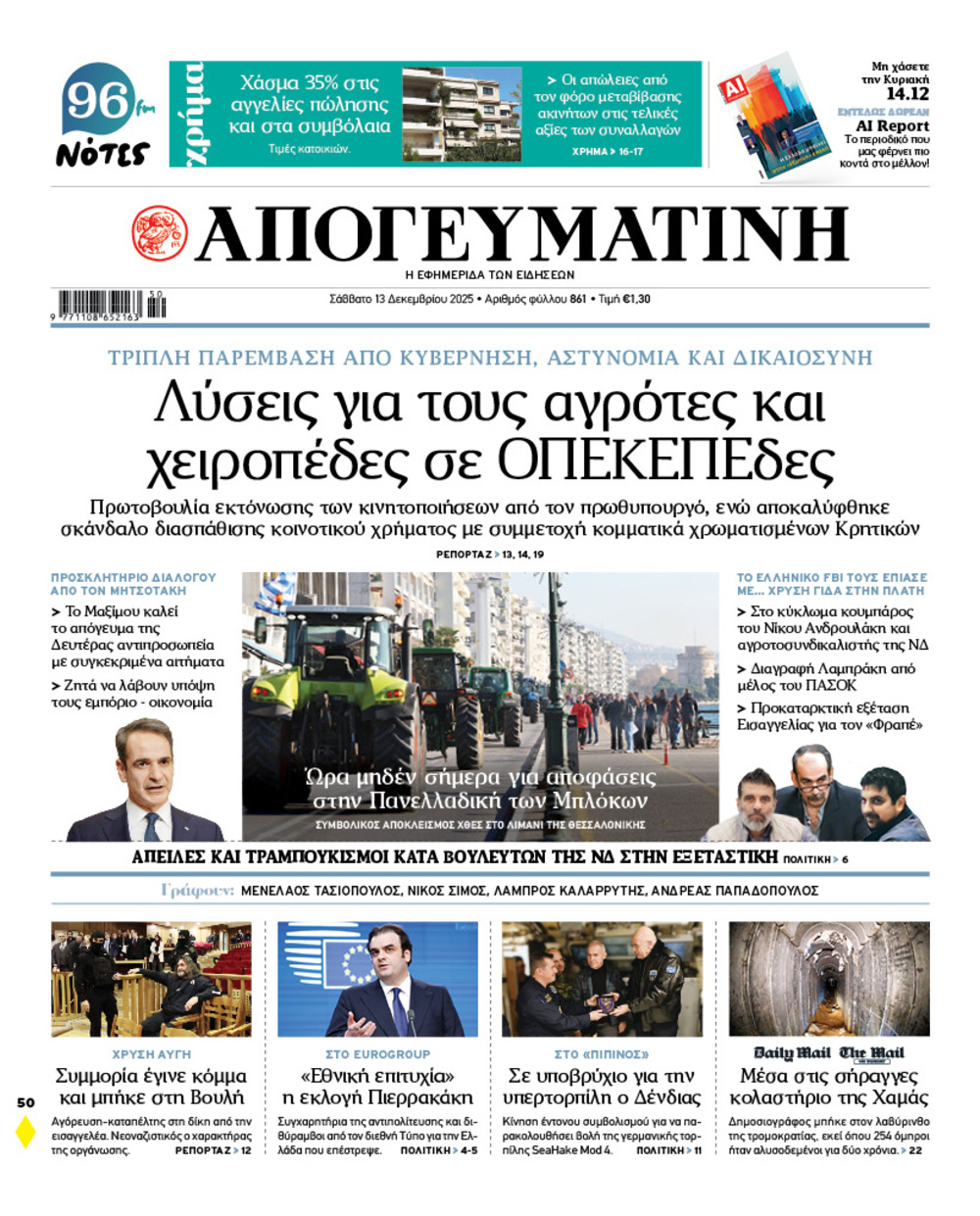 Διαβάστε σήμερα στην Απογευματινή: Λύσεις για τους αγρότες και χειροπέδες σε ΟΠΕΚΕΠΕδες