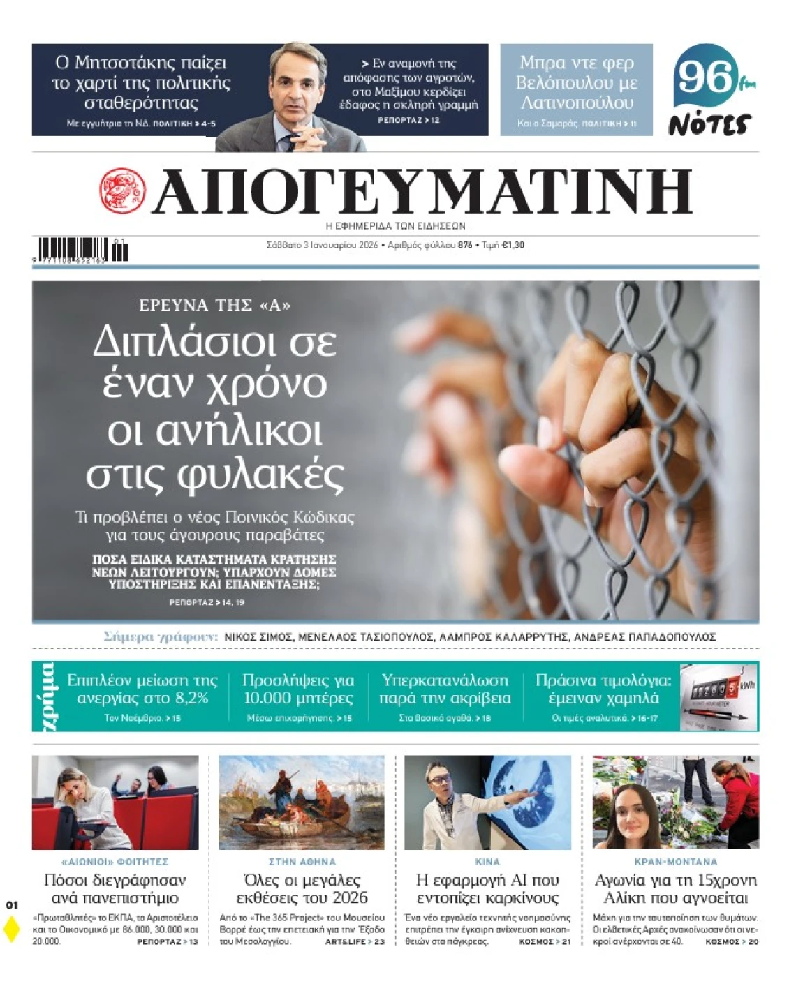 Διαβάστε στην Απογευματινή: Έρευνα της «Α»: Διπλάσιοι σε έναν χρόνο οι ανήλικοι στις φυλακές