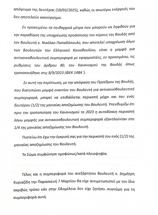 Με την περικοπή κατά 1/2 της βουλευτικής της αποζημίωσης τιμωρήθηκε ο βουλευτής Β’ Θεσσαλονίκης της «Νίκης» Νίκος Παπαδόπουλος. Η περικοπή ανακοινώθηκε το πρωί της Τετάρτης από τον πρόεδρο της Βουλής Νικήτα Κακλαμάνη και έρχεται στον απόηχο των όσων διαδραματίστηκαν στο μεσημέρι της Δευτέρας, στην Εθνική Πινακοθήκη, με πρωταγωνιστή τον βουλευτή της «Νίκης». Παράλληλα ο κ. Ο Κακλαμάνης του απέδωσε μομφή για αντικοινοβουλευτική συμπεριφορά.