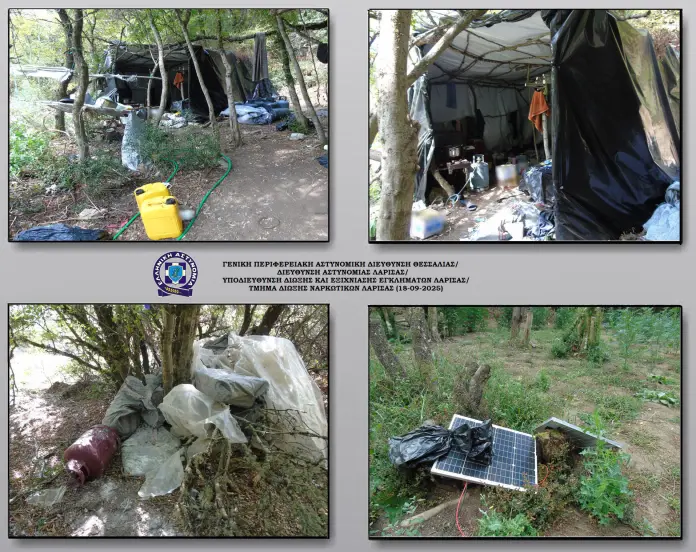 Οι αστυνομικοί της Δίωξης Ναρκωτικών Λάρισας είχαν θέσει υπό παρακολούθηση την περιοχή για ημέρες, αξιοποιώντας πληροφορίες που έφτασαν στις υπηρεσίες τους. Την Πέμπτη, αποφασίστηκε η επέμβαση των δυνάμεων, κατά την οποία εντοπίστηκαν στον χώρο προσωπικά αντικείμενα των καλλιεργητών, 24,2 κιλά ακατέργαστης κάνναβης, φορητοί ασύρματοι, κινητά τηλέφωνα και γεωργικά εργαλεία.