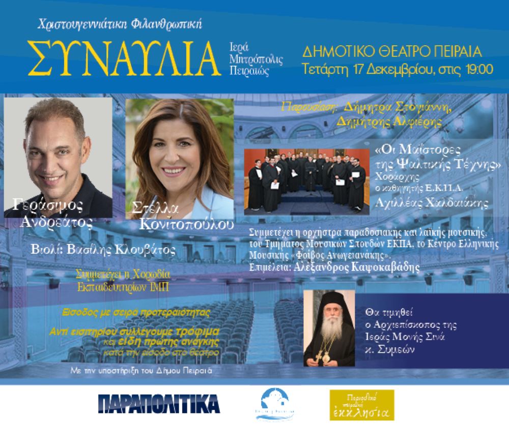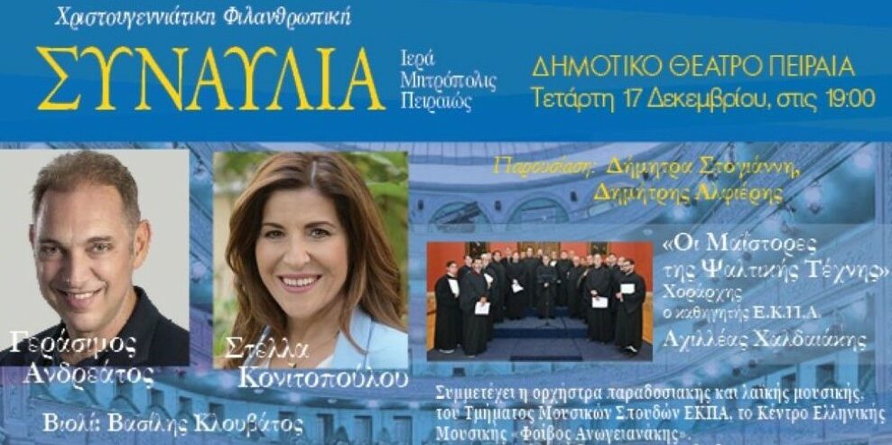 Την Τετάρτη 17 Δεκεμβρίου 2025 στις 19:00, η Ιερά Μητρόπολη Πειραιώς διοργανώνει τη μεγάλη Χριστουγεννιάτικη Φιλανθρωπική Συναυλία στο Δημοτικό Θέατρο της πόλης, με την υποστήριξη του Δήμου Πειραιά. Στην εκδήλωση θα συμμετάσχουν ο Γεράσιμος Ανδρεάτος και η Στέλλα Κονιτοπούλου, προσφέροντας μια μουσική βραδιά με στόχο τη συλλογή τροφίμων και ειδών πρώτης ανάγκης για όσους έχουν ανάγκη.