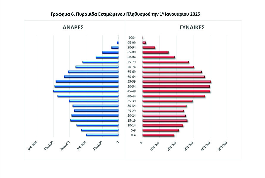Αναλυτικότερα, σύμφωνα με τα στοιχεία της ΕΛΣΤΑΤ, ο μόνιμος πληθυσμός της χώρας κατά την 1η Ιανουαρίου 2025 εκτιμάται σε 10.372.335 άτομα, μειωμένος κατά 0,03% σε σχέση με τον πληθυσμό την 1η Ιανουαρίου 2024 που έχει αναθεωρηθεί σε 10.375.764 άτομα. Η εξέλιξη αυτή είναι αποτέλεσμα της φυσικής μείωσης του πληθυσμού που ανήλθε σε 57.564 άτομα (68.309 γεννήσεις έναντι 125.873 θανάτων ατόμων που διαμένουν εντός της ελληνικής επικράτειας) και της καθαρής μετανάστευσης που εκτιμάται σε 54.135 άτομα (η μεγαλύτερη μετά το 2000) και αντιστοιχεί στη διαφορά μεταξύ 132.149 εισερχόμενων και 78.014 εξερχόμενων μεταναστών. Για το 2023, η καθαρή μετανάστευση έχει αναθεωρηθεί σε 29.816 άτομα (116.591 εισερχόμενοι και 86.775 εξερχόμενοι μετανάστες).