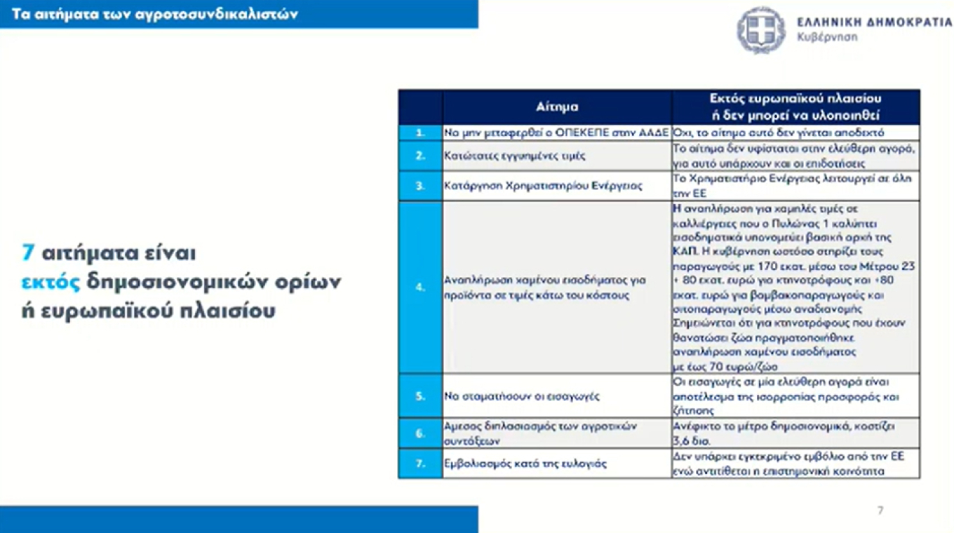 Σύμφωνα με την κυβέρνηση, 20 από τα 27 αιτήματα που έχουν καταθέσει οι αγρότες είτε έχουν ήδη υλοποιηθεί είτε βρίσκονται σε διαδικασία επεξεργασίας, ενώ τα υπόλοιπα επτά δεν μπορούν να προχωρήσουν λόγω περιορισμών της ΚΑΠ ή δημοσιονομικών αδυναμιών.
