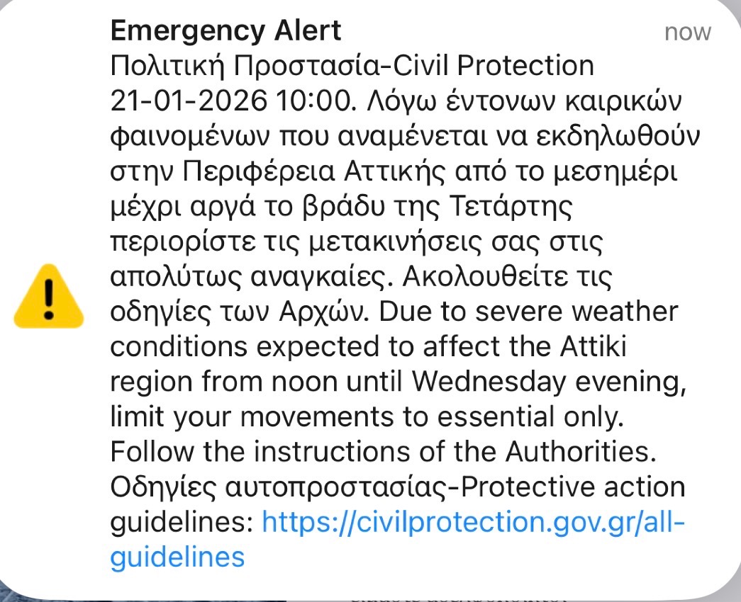 Σε κατάσταση αυξημένης ετοιμότητας βρίσκονται οι αρμόδιες αρχές ενόψει της κακοκαιρίας που αναμένεται να πλήξει την Αττική την Τετάρτη 21 Ιανουαρίου 2026. Η Πολιτική Προστασία απευθύνει έκκληση στους πολίτες να είναι ιδιαίτερα προσεκτικοί από τις μεσημβρινές ώρες έως αργά το βράδυ, με σχετική προειδοποίηση να αποστέλλεται μέσω του συστήματος 112.