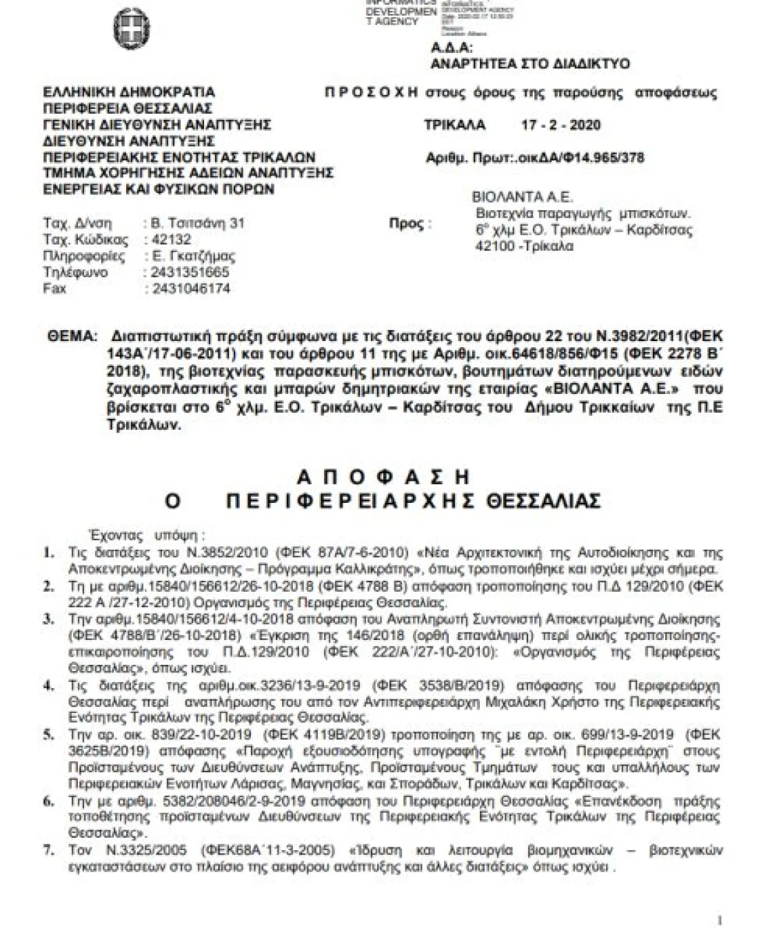 Έγγραφο της Περιφέρειας Θεσσαλίας, με ημερομηνία 17 Φεβρουαρίου 2020, φαίνεται να αποτελεί κρίσιμο στοιχείο της υπόθεσης. Σε αυτό επισημαινόταν ότι οι δύο δεξαμενές προπανίου βρίσκονταν σε μικρότερη από την προβλεπόμενη απόσταση από τα όρια της ιδιοκτησίας.