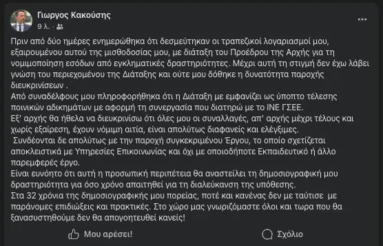 Σε ανάρτησή του, ο Γιώργος Κακούσης τόνισε ότι όλες του οι οικονομικές πράξεις είναι νόμιμες, διαφανείς και πλήρως ελέγξιμες. Οι συναλλαγές του συνδέονται αποκλειστικά με την παροχή υπηρεσιών επικοινωνίας και όχι με εκπαιδευτικά ή άλλα έργα. Ο δημοσιογράφος υπογραμμίζει ότι η υπόθεση αποτελεί προσωπική περιπέτεια και επηρεάζει προσωρινά τη δημοσιογραφική του δραστηριότητα.