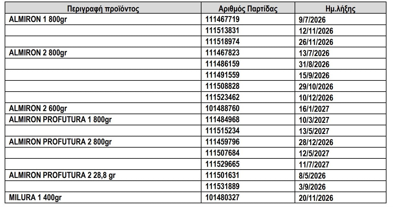 Οι παρτίδες που ανακαλούνται είναι οι εξής, σύμφωνα με πίνακα που δημοσίευσε ο ΕΟΦ: