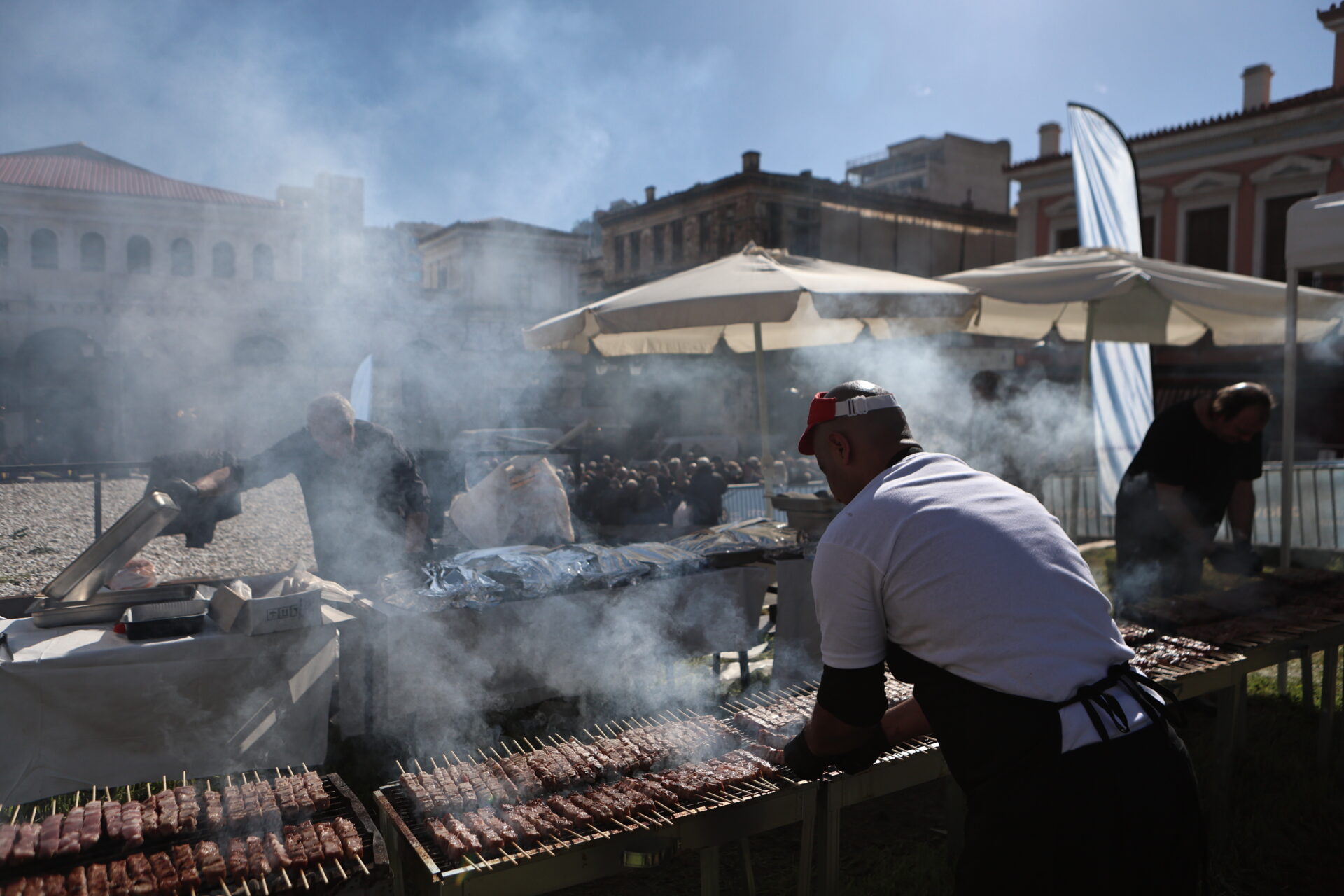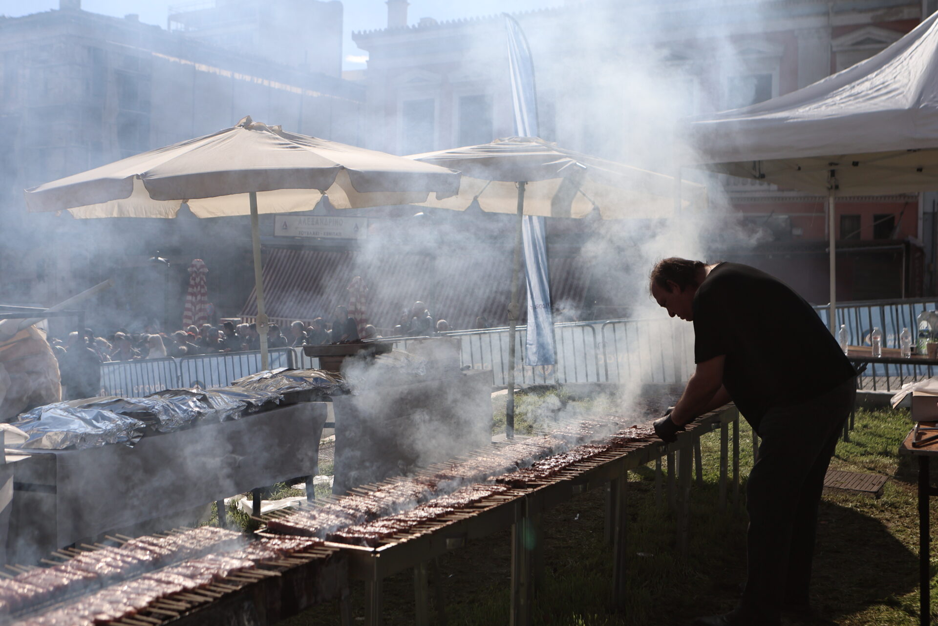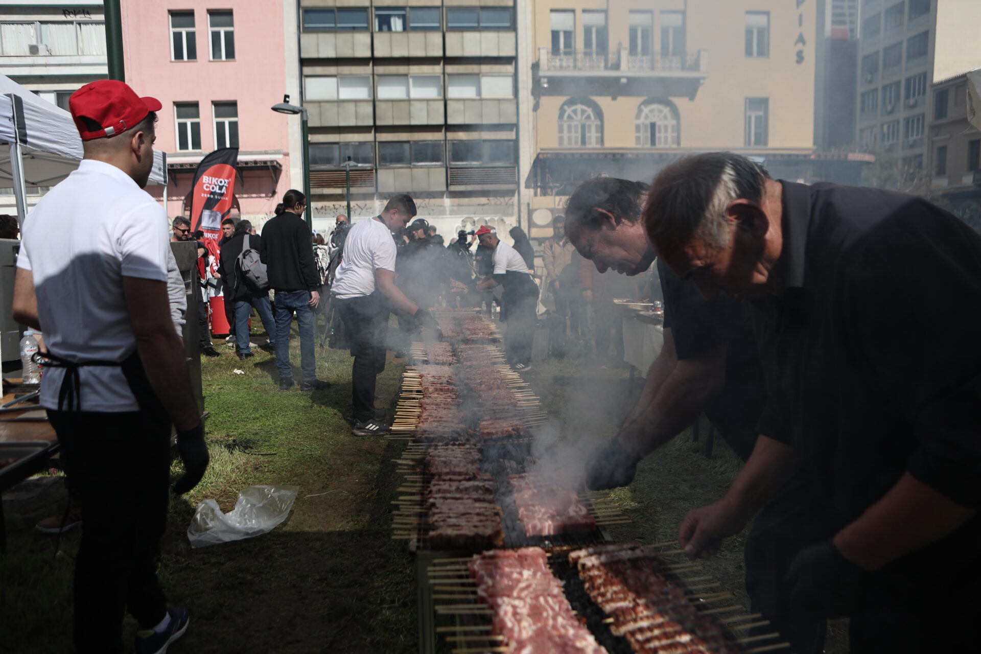 Έξω από την αγορά, στην οδό Αθηνάς, στήθηκαν μεγάλες ψησταριές και σύμφωνα με τον σχεδιασμό της ημέρας αναμένεται να ψηθούν περισσότερα σχεδόν ένας τόνος κρέατος, τα οποία προσφέρονται δωρεάν στον κόσμο.