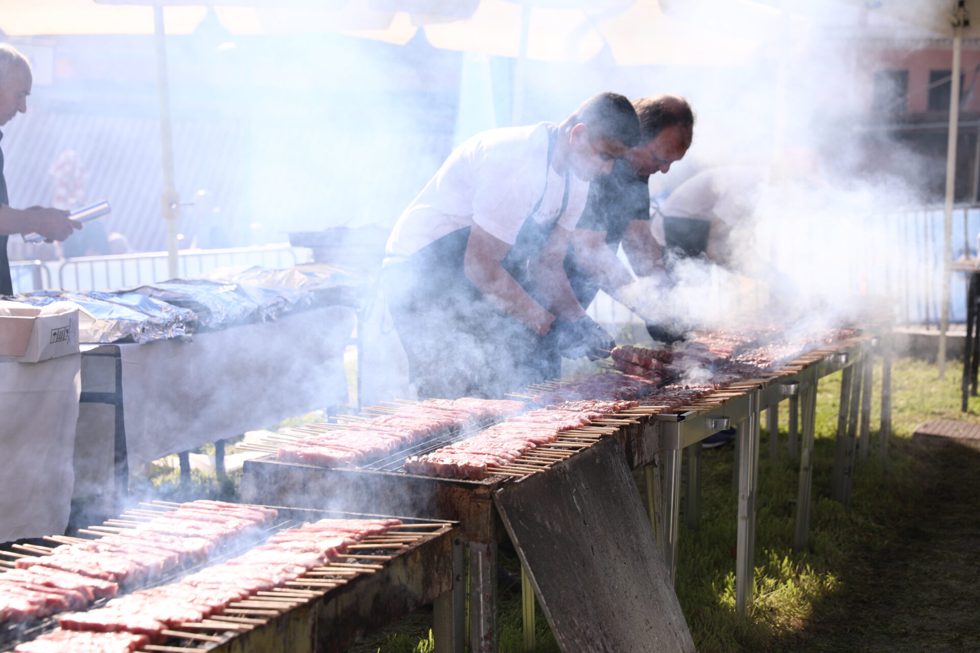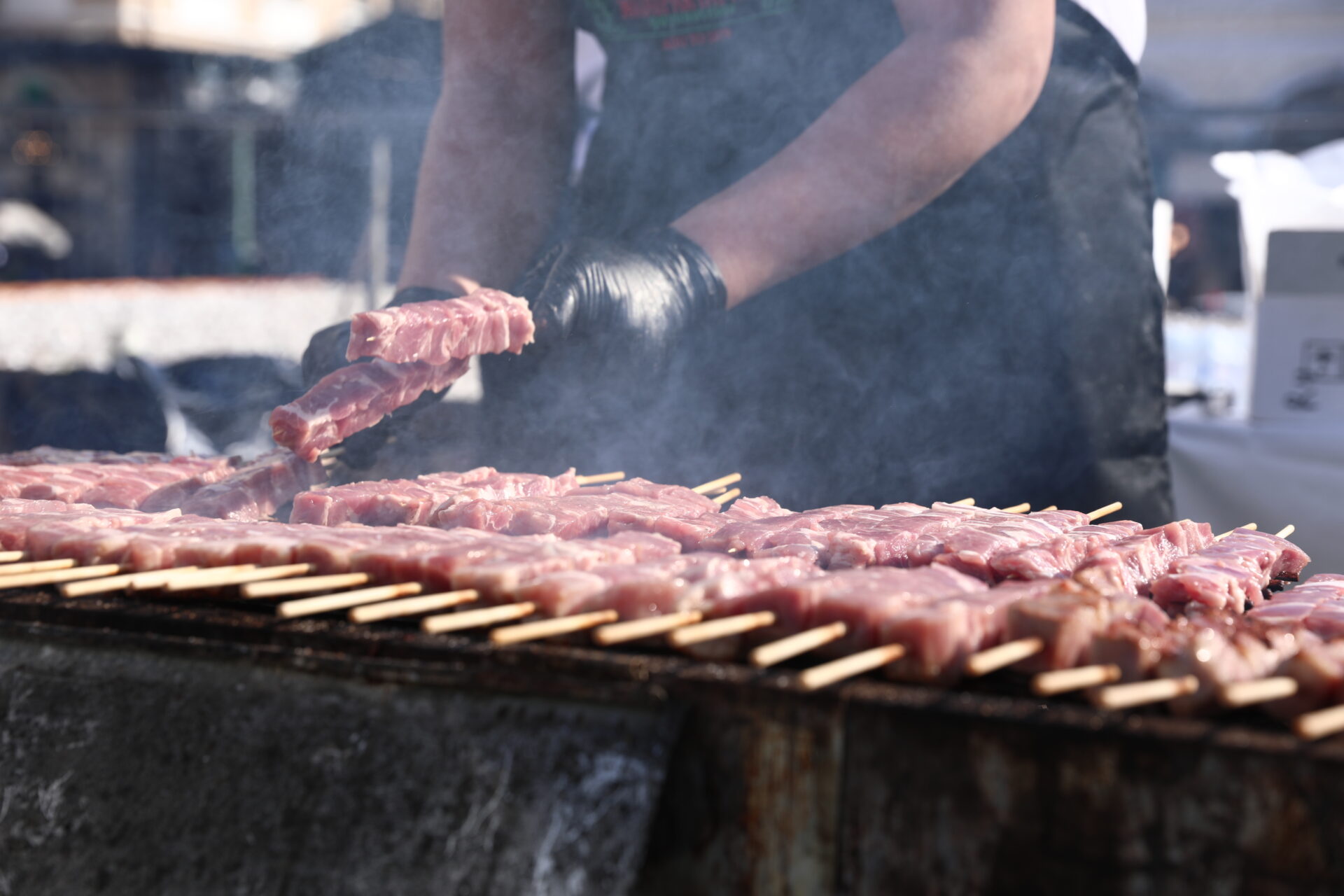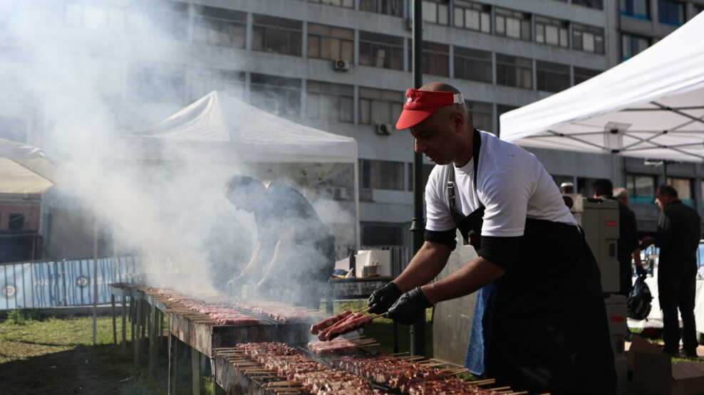 Έξω από την αγορά, στην οδό Αθηνάς, στήθηκαν μεγάλες ψησταριές και σύμφωνα με τον σχεδιασμό της ημέρας αναμένεται να ψηθούν περισσότερα σχεδόν ένας τόνος κρέατος, τα οποία προσφέρονται δωρεάν στον κόσμο.