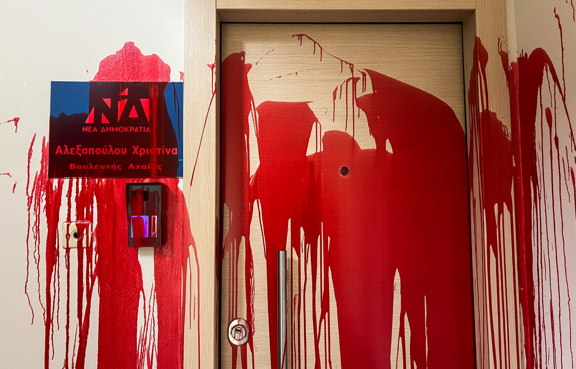 Επίθεση με μπογιές σημειώθηκε στο πολιτικό γραφείο της βουλευτού Αχαΐας της Νέας Δημοκρατίας, Χριστίνας Αλεξοπούλου, που βρίσκεται στην Πάτρα, στο επάνω μέρος της Πλατείας Γεωργίου.