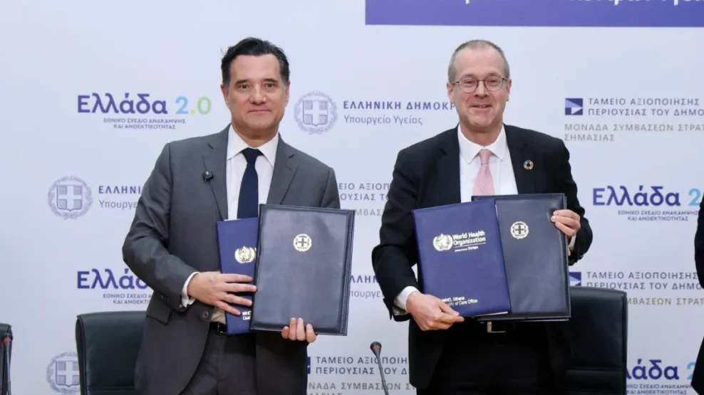 Στο πλαίσιο της περαιτέρω ενίσχυσης των δεσμών Ελλάδας – ΠΟΥ, ο υπουργός Υγείας Άδωνις Γεωργιάδης και ο Χανς Κλούγκε υπέγραψαν σειρά νέων συμφωνιών συνεργασίας, λίγο πριν από την εκδήλωση παρουσίασης της ηλεκτρονικής πλατφόρμας «Quality-for-All». Οι συμφωνίες αφορούν κυρίως την αναβάθμιση της Ποιότητας της Φροντίδας και την ενίσχυση της Ψυχικής Υγείας.