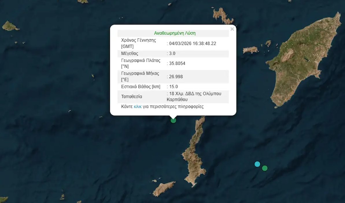 Σεισμός μεγέθους 3 βαθμών της κλίμακας Ρίχτερ σημειώθηκε στην Κάρπαθο το απόγευμα της Τετάρτης (04.03.2026), σύμφωνα με το Γεωδυναμικό Ινστιτούτο του Εθνικού Αστεροσκοπείου Αθηνών.