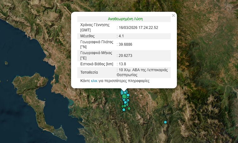 Σεισμική δόνηση μεγέθους 4,1 Ρίχτερ σημειώθηκε στην Λεπτοκαριά Θεσπρωτίας.