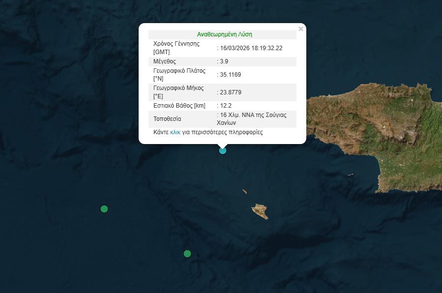 Σεισμική δόνηση μεγέθους 3,9 Ρίχτερ σημειώθηκε στη περιοχή Σούγια Χανίων