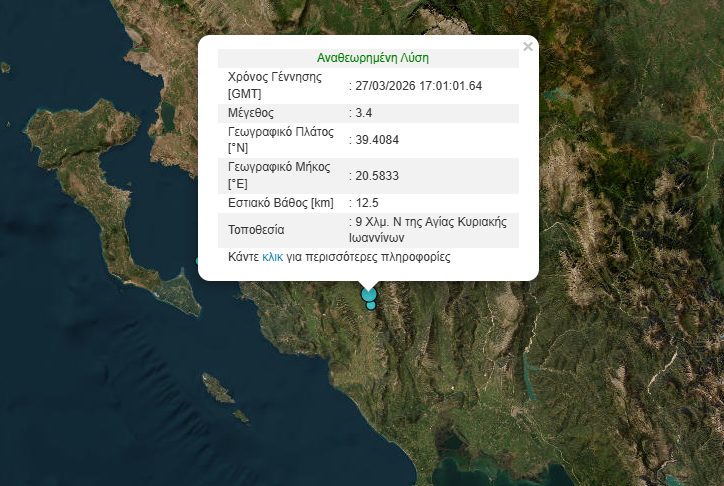 Σεισμός μεγέθους 3,4 βαθμών της κλίμακας Ρίχτερ σημειώθηκε στα Ιωάννινα στις 7:01 το απόγευμα της Παρασκευής (27.03.2026), σύμφωνα με το Γεωδυναμικό Ινστιτούτο του Εθνικού Αστεροσκοπείου Αθηνών.