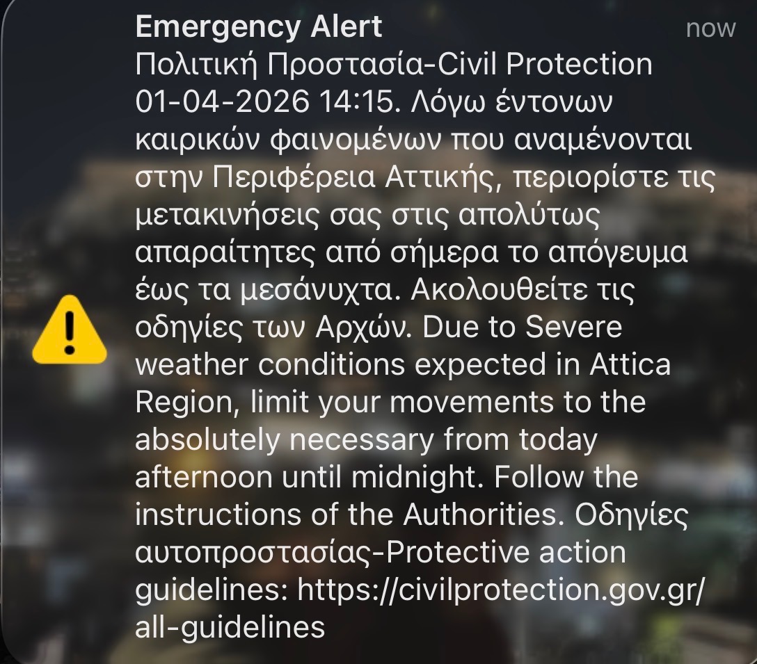 Παράλληλα, εστάλη προειδοποιητικό μήνυμα μέσω του 112 στους κατοίκους της Αττικής, με σαφείς οδηγίες για τον περιορισμό των μετακινήσεων.