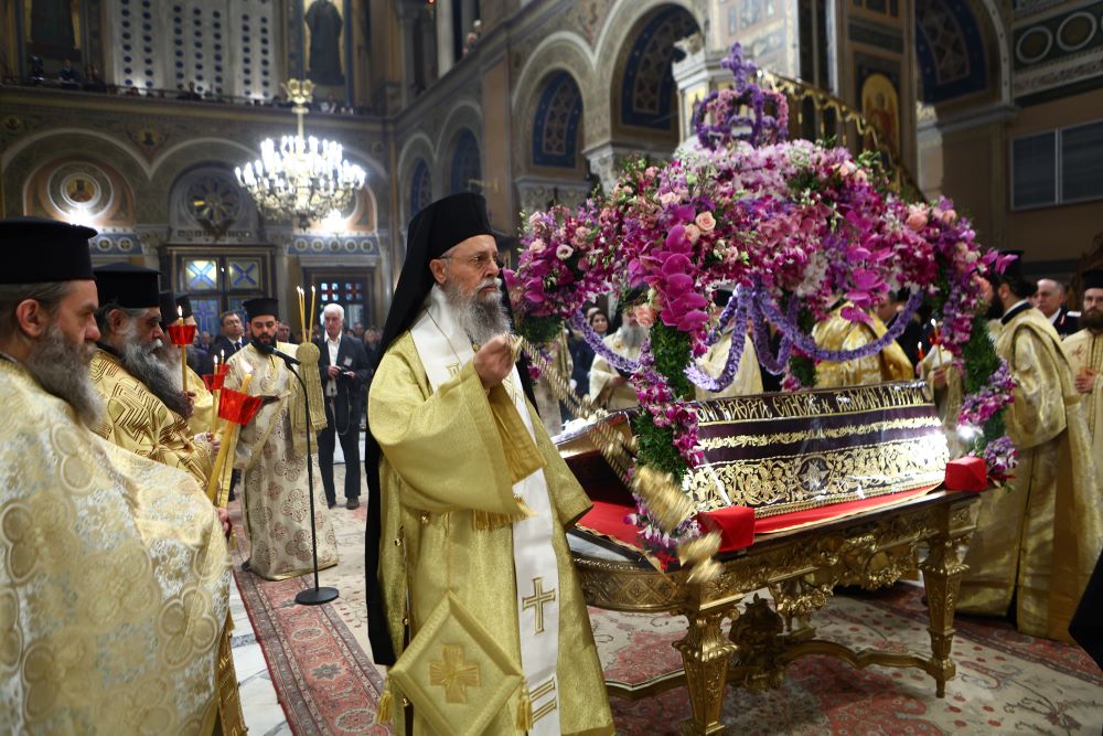 Σε κλίμα βαθιάς συγκίνησης και θρησκευτικής κατάνυξης τελείται το βράδυ της Μεγάλης Παρασκευής η Ακολουθία του Επιταφίου στον Ιερό Μητροπολιτικό Ναό Αθηνών. Από νωρίς το απόγευμα, πλήθος πιστών κατέκλυσε το κέντρο της πόλης, προκειμένου να συμμετάσχει στη σημαντικότερη ημέρα του ορθόδοξου πένθους, τιμώντας τη Σταύρωση και την Ταφή του Χριστού.
