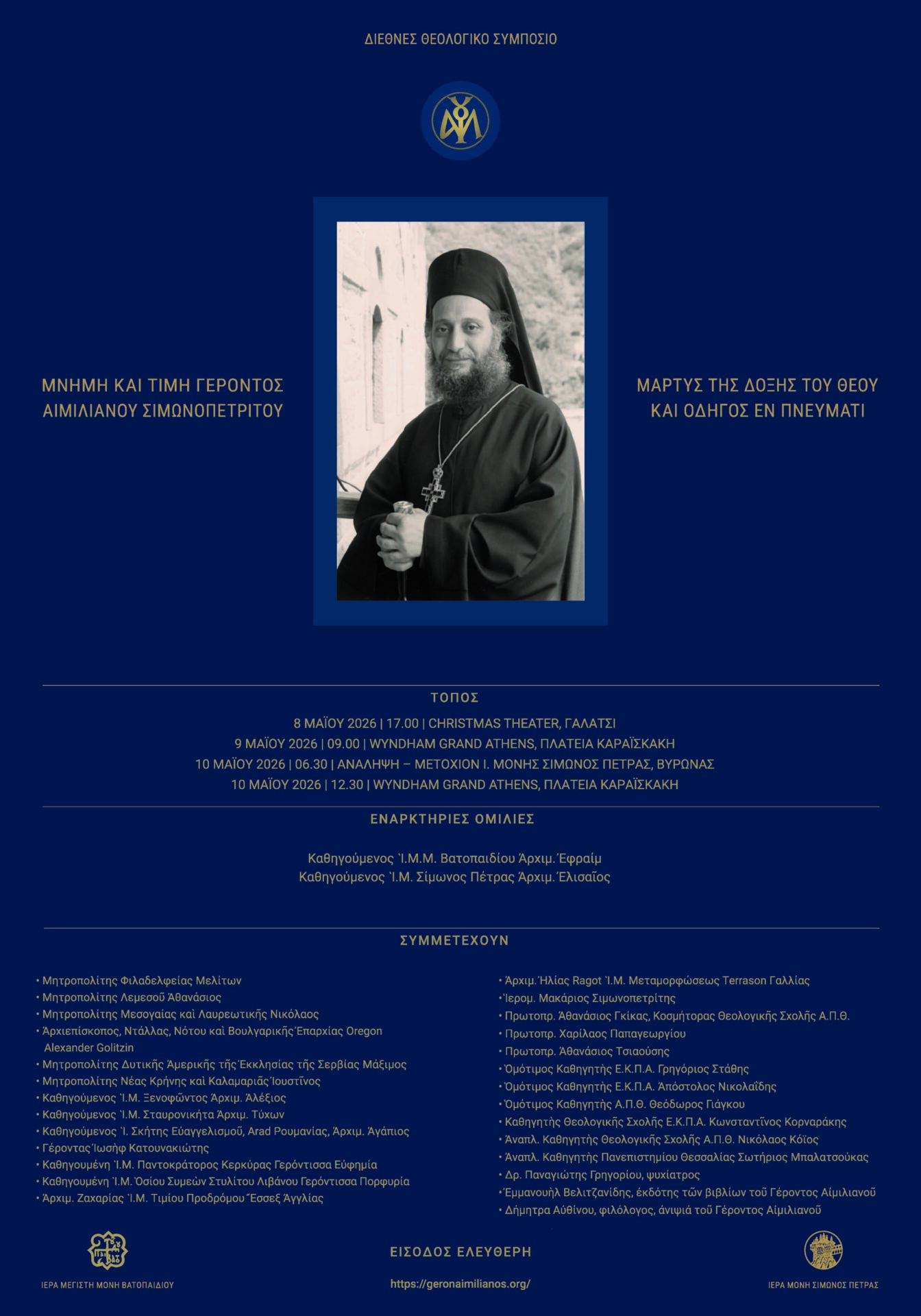 Η Ιερά Μεγίστη Μονή Βατοπαιδίου και η Ιερά Μονή Σίμωνος Πέτρας, διοργανώνουν Διεθνές Θεολογικό Συμπόσιο με θέμα «Μνήμη και τιμή Γέροντος Αιμιλιανού Σιμωνοπετρίτου: Mάρτυς της δόξης του Θεού και οδηγός εν Πνεύματι». Το διεθνές αυτό Θεολογικό Συμπόσιο θα πραγματοποιηθεί στην Αθήνα από τις 8 έως τις 10 Μαΐου 2026. H επίσημη έναρξη θα γίνει στο Christmas Theater (Ολυμπιακό Ακίνητο Γαλατσίου) την Παρασκευή 8 Μαΐου και ώρα 5:00 μ.μ., ενώ οι εργασίες του Συμποσίου στις 9 και 10 Μαΐου στο Wyndham Grand Hotel (Μ. Αλεξάνδρου 2, Πλατεία Καραϊσκάκη).