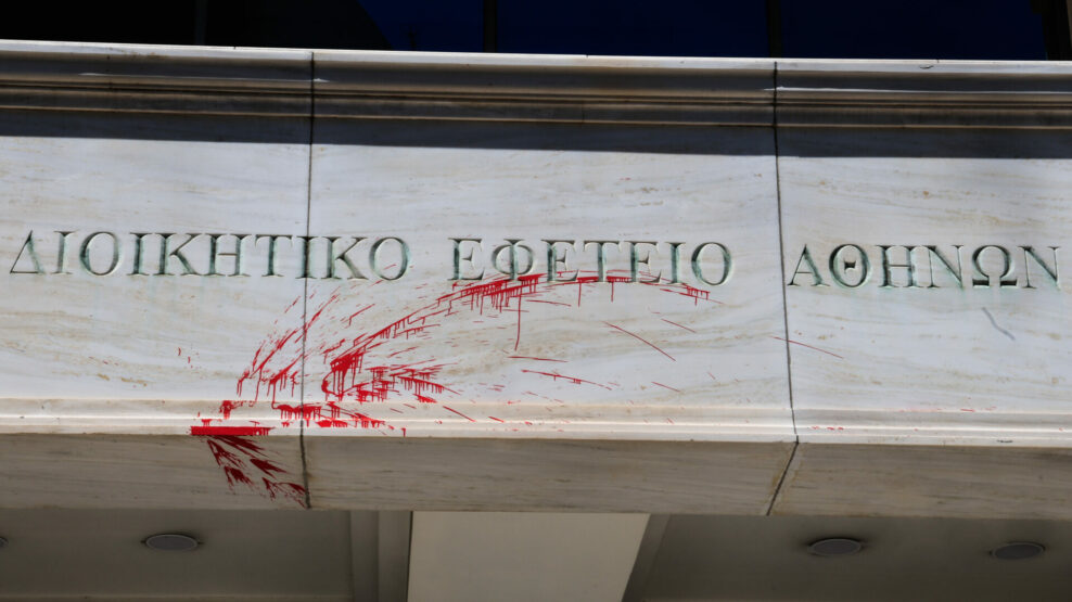 Υλικές ζημιές στην κεντρική είσοδο του Διοικητικού Εφετείου Αθηνών προκάλεσε ομάδα αγνώστων ατόμων το βράδυ της προηγούμενης ημέρας, χρησιμοποιώντας βαριοπούλες και ρίχνοντας μπογιές στον εξωτερικό χώρο του κτιρίου. Οι δράστες είχαν καλυμμένα τα χαρακτηριστικά τους και εξαπέλυσαν την επίθεση πριν αποχωρήσουν.