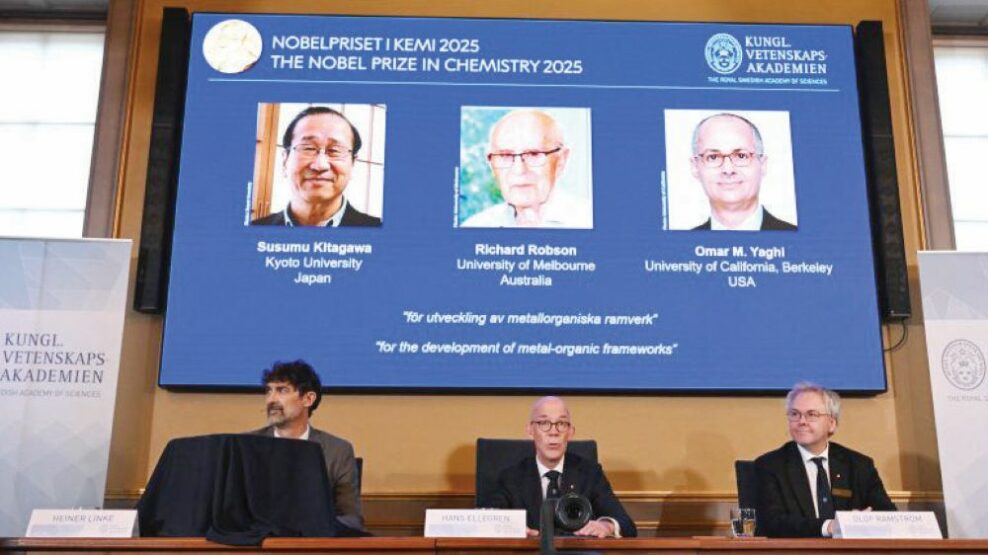 Για την ανακάλυψη υλικών, ικανών να αντιμετωπίσουν σημαντικά προβλήματα, όπως η κλιματική κρίση και η έλλειψη πόσιμου νερού, βραβεύτηκαν με το φετινό Νόμπελ Χημείας οι επιστήμονες Σουσούμου Κιταγκάουα, Ρίτσαρντ Ρόμπσον και Όμαρ Γιαγκί. Ανέπτυξαν μια νέα μορφή μοριακής αρχιτεκτονικής, τα μεταλλο-οργανικά πλαίσια (metal-organic frameworks – MOFs), τα οποία διαθέτουν μεγάλα κενά, επιτρέποντας να ρέουν μέσα από αυτά αέρια και άλλες χημικές ουσίες.