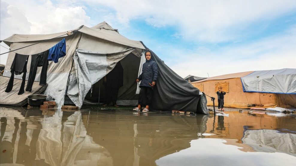Με τις πρώτες καταρρακτώδεις βροχές της χρονιάς ήρθαν αντιμέτωποι το Σαββατοκύριακο οι κάτοικοι στην πολύπαθη Λωρίδα της Γάζας. Καταρράκτες νερού μετέτρεψαν τον καταυλισμό σκηνών Μουάσι σε έναν απέραντο λασπότοπο. Σκάβοντας αυλάκια, οι Παλαιστίνιοι προσπαθούσαν να εμποδίσουν το νερό να εισχωρήσει στις σκηνές τους και να καταστρέψει τα ελάχιστα υπάρχοντά τους, την ώρα που η βροχή διαπερνούσε τις σκισμένες τέντες και οι ισχυροί άνεμοι παρέσερναν τους διάτρητους μουσαμάδες.