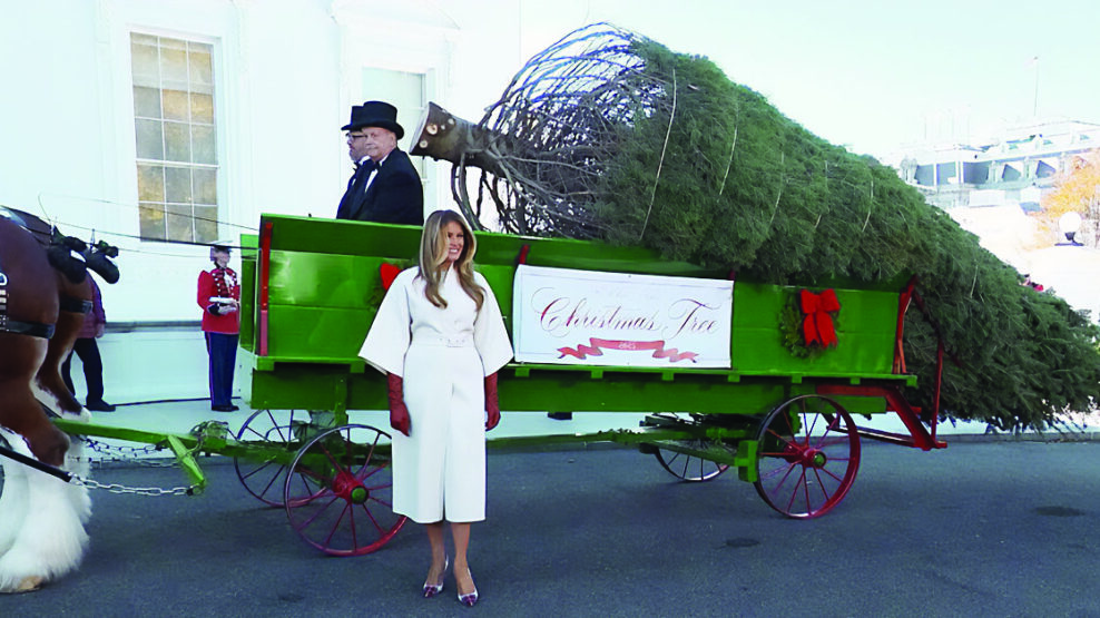 Φορώντας μπεζ παλτό και σκούρα κόκκινα γάντια, η Μελάνια υποδέχθηκε την άμαξα που έσερναν δύο άλογα ράτσας Κλαϊντσντέιλ και χαιρέτησε τους οδηγούς με τα ημίψηλα καπέλα. Το δέντρο ύψους 5,5 μέτρων και ηλικίας 20 ετών θα τοποθετηθεί στην Μπλε Αίθουσα του Λευκού Οίκου, όπου θα διακοσμηθεί για τις χριστουγεννιάτικες εκδηλώσεις.