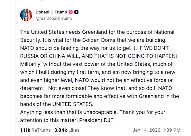 Σε ανάρτησή του στην πλατφόρμα Truth Social, ο Τραμπ υποστήριξε ότι οι Ηνωμένες Πολιτείες «χρειάζονται τη Γροιλανδία για λόγους εθνικής ασφάλειας» και κάλεσε το ΝΑΤΟ να διαδραματίσει ρόλο ώστε να περάσει υπό αμερικανικό έλεγχο. Προειδοποίησε μάλιστα ότι, αν δεν κινηθούν οι ΗΠΑ, το κενό θα καλύψουν η Ρωσία ή η Κίνα, κάτι που, όπως τόνισε, δεν πρόκειται να επιτρέψει.