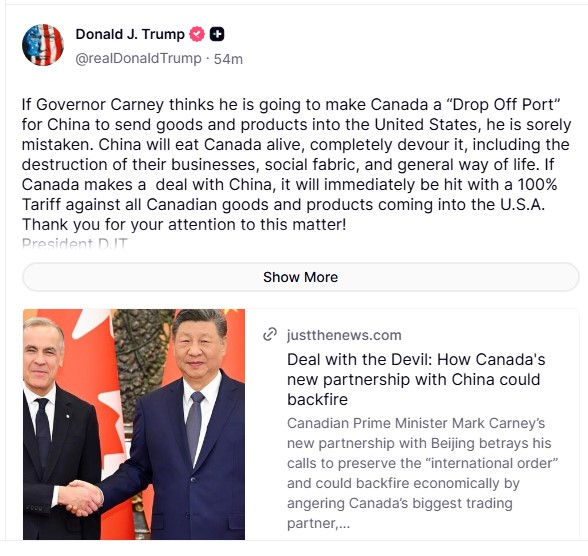 Ο Τραμπ χρησιμοποίησε ιδιαίτερα σκληρή φρασεολογία, υποστηρίζοντας ότι σε περίπτωση στενότερης οικονομικής συνεργασίας με το Πεκίνο, «η Κίνα θα φάει τον Καναδά ζωντανό». Σύμφωνα με τον ίδιο, μια τέτοια συμφωνία θα οδηγούσε στην αποδόμηση των καναδικών επιχειρήσεων, θα έπληττε τον κοινωνικό ιστό της χώρας και θα αλλοίωνε τον τρόπο ζωής των πολιτών της.