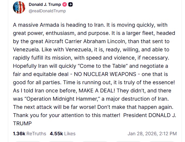 Ο Τραμπ ανέφερε ότι ισχυρή αμερικανική ναυτική δύναμη, με επικεφαλής το αεροπλανοφόρο USS Abraham Lincoln, κινείται με «ταχύτητα, ισχύ και αποφασιστικότητα» προς την περιοχή, επισημαίνοντας ότι πρόκειται για στόλο μεγαλύτερο από εκείνον που είχε σταλεί στο παρελθόν στη Βενεζουέλα. Όπως σημείωσε, η παρουσία αυτή αποσκοπεί στο να καταστήσει σαφές πως η Ουάσινγκτον είναι έτοιμη για κάθε ενδεχόμενο.