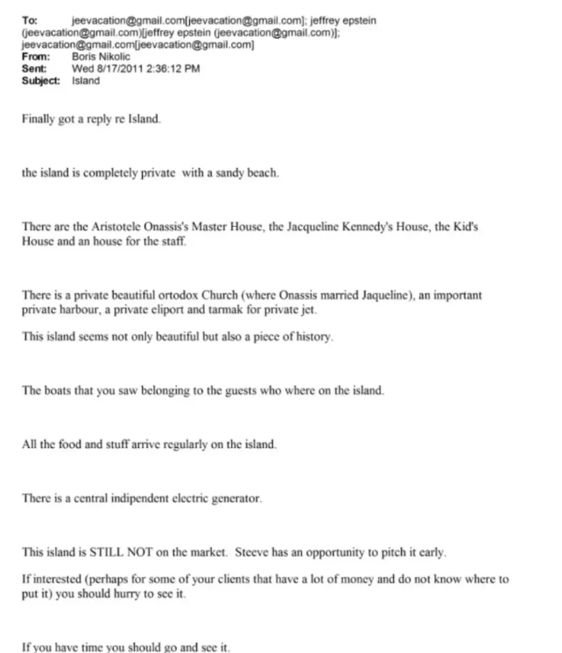 Στις 17 Αυγούστου 2011, ο Νίκολιτς ενημέρωσε τον Έπσταϊν ότι ο Σκορπιός διαθέτει κατοικίες, ελικοδρόμιο και συνδέεται ιστορικά με τον Αριστοτέλη Ωνάση και την Τζάκι Κένεντι. Ακολούθησαν περαιτέρω μηνύματα με τον Ζιρό, με τον Έπσταϊν να ζητά διευκρινίσεις για το κοντινότερο αεροδρόμιο και το επίπεδο απομόνωσης του νησιού.