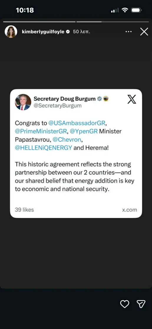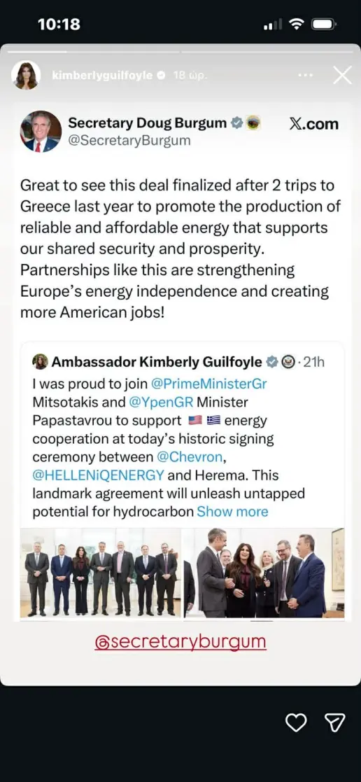 Σε επόμενη ανάρτησή του, ο Νταγκ Μπέργκαμ συνεχάρη την Κίμπερλι Γκίλφοϊλ, τον Έλληνα πρωθυπουργό Κυριάκο Μητσοτάκη και την κοινοπραξία Chevron-HelleniQ Energy, χαρακτηρίζοντας τη συμφωνία «ιστορική». Όπως τόνισε, αντανακλά τη στενή συνεργασία ΗΠΑ-Ελλάδας και αναδεικνύει τον κρίσιμο ρόλο της ενέργειας για την οικονομική και εθνική ασφάλεια των δύο χωρών.