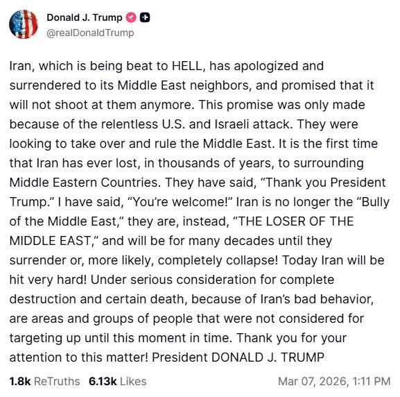Στην ίδια ανάρτηση, ο Τραμπ ισχυρίστηκε ότι για πρώτη φορά εδώ και χιλιάδες χρόνια το Ιράν «χάνει» απέναντι στις χώρες της περιοχής. Υποστήριξε επίσης ότι γειτονικά κράτη της Μέσης Ανατολής τον ευχαρίστησαν για τη στάση του, τονίζοντας ότι το Ιράν δεν αποτελεί πλέον τον «νταή της Μέσης Ανατολής», αλλά «τον ηττημένο της Μέσης Ανατολής», μια κατάσταση που –όπως είπε– θα διαρκέσει για πολλές δεκαετίες, εκτός αν η χώρα παραδοθεί ή καταρρεύσει πλήρως.