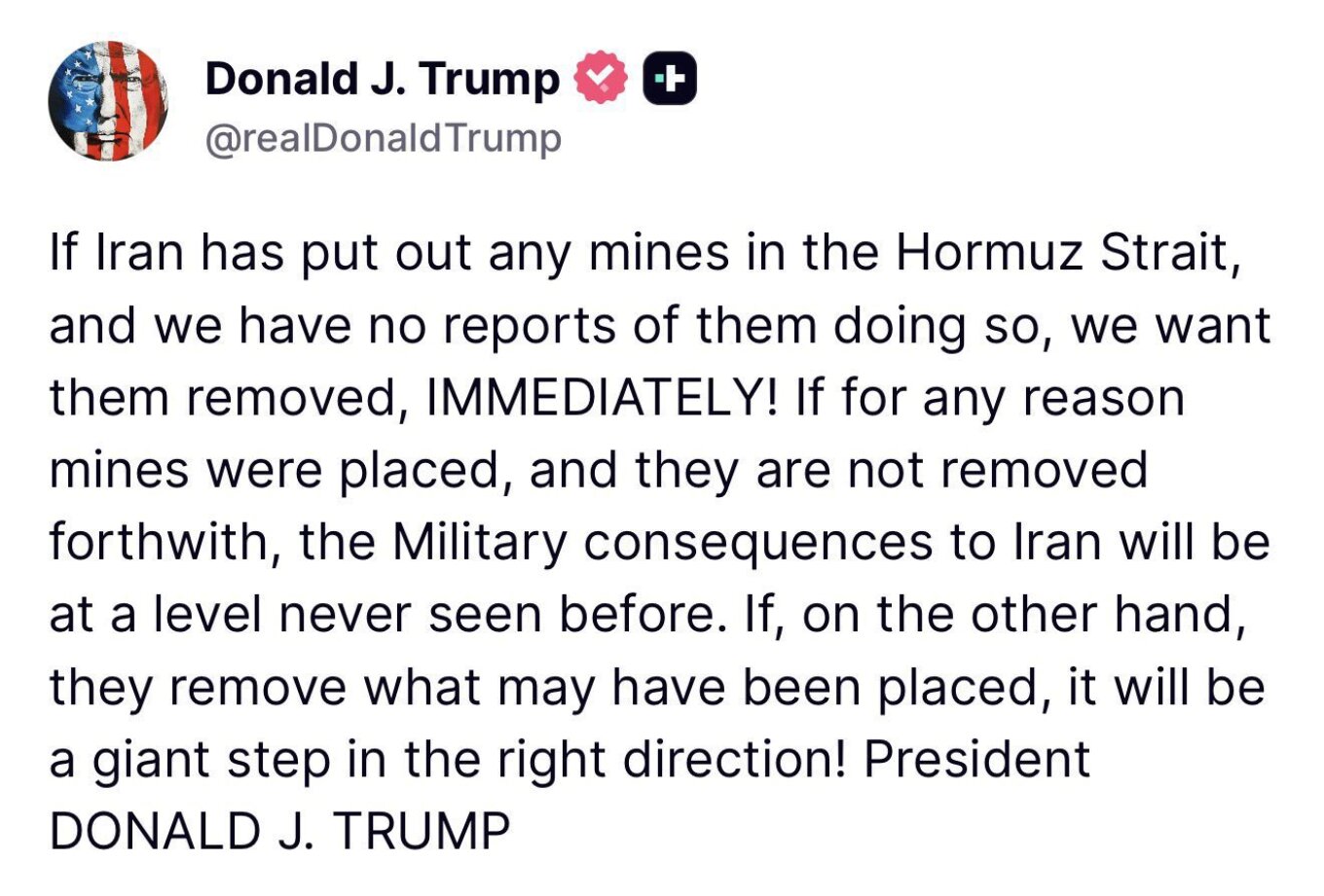 Σε ανάρτησή του ο Αμερικανός πρόεδρος γράφει μεταξύ άλλων ότι «εάν το Ιράν έχει τοποθετήσει νάρκες στα Στενά του Ορμούζ -δεν έχουμε καμία αναφορά ότι το έχει κάνει- θέλουμε να αφαιρεθούν αμέσως». Απειλεί δε ότι «εάν για οποιονδήποτε λόγο έχουν τοποθετηθεί νάρκες και δεν αφαιρεθούν αμέσως, οι στρατιωτικές συνέπειες για το Ιράν θα είναι σε επίπεδο που δεν έχει ξαναδεί». Σε περίπτωση όμως που έχουν αφαιρεθούν οι νάρκες που τυχόν έχουν τοποθετηθεί, «αυτό θα είναι ένα τεράστιο βήμα προς τη σωστή κατεύθυνση».