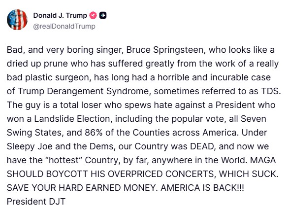 «Ο Μπρους Σπρίνγκστιν, αυτός ο μέτριος και βαρετός τραγουδιστής, που μοιάζει με ένα ξερό δαμάσκηνο και που εμφανώς φέρει τα σημάδια ενός αποτυχημένου πλαστικού χειρουργού, πάσχει εδώ και καιρό από ένα φρικτό και ανίατο σύνδρομο διαταραχής κατά του Τραμπ», έγραψε ο πρόεδρος των ΗΠΑ σε μήνυμά του που δημοσιεύτηκε στην πλατφόρμα του Truth Social.
