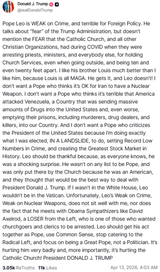 «Ο Πάπας Λέων είναι ΑΔΥΝΑΜΟΣ στο Έγκλημα και απαίσιος στην Εξωτερική Πολιτική. Μιλά για τον “φόβο” της κυβέρνησης Τραμπ, αλλά δεν αναφέρει τον ΦΟΒΟ που είχε η Καθολική Εκκλησία, και όλες οι άλλες χριστιανικές οργανώσεις, κατά τη διάρκεια του COVID, όταν συνελάμβαναν ιερείς, πάστορες και όλους τους υπόλοιπους επειδή τελούσαν λειτουργίες, ακόμη κι όταν βρίσκονταν σε εξωτερικούς χώρους και κρατούσαν αποστάσεις δέκα ή ακόμη και είκοσι ποδιών.
