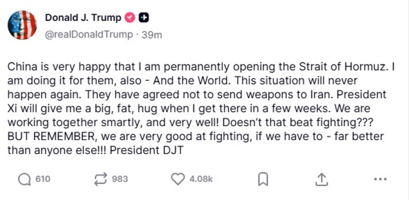 «Η Κίνα είναι πολύ ευχαριστημένη που ανοίγω μόνιμα τα Στενά του Ορμούζ. Το κάνω και για χάρη τους – και για χάρη του κόσμου. Αυτή η κατάσταση δεν θα ξανασυμβεί ποτέ. Έχουν συμφωνήσει να μην στέλνουν όπλα στο Ιράν. Ο Πρόεδρος Σι θα μου δώσει μία μεγάλη, δυνατή αγκαλιά όταν φτάσω εκεί σε λίγες εβδομάδες» τόνισε χαρακτηριστικά.