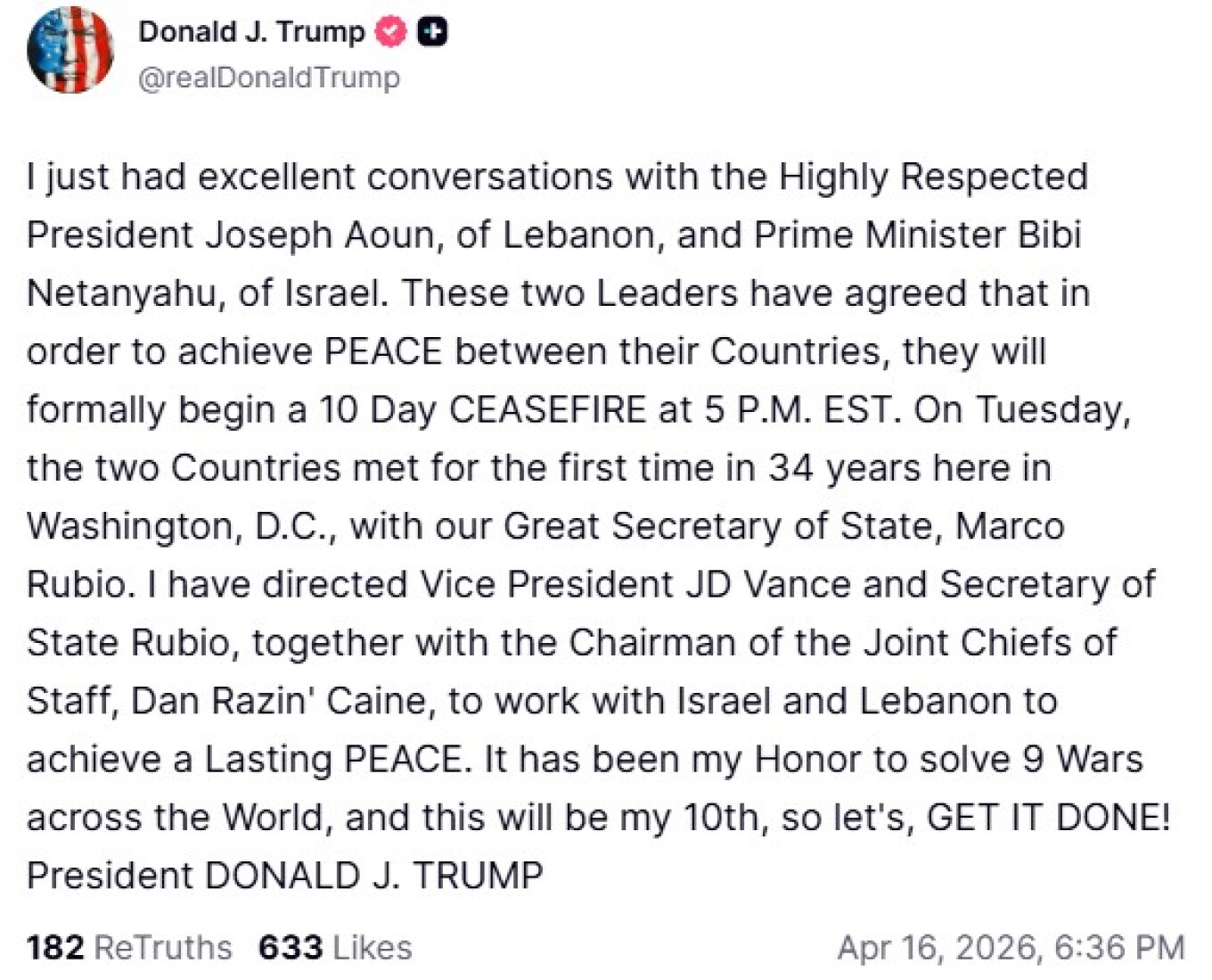 Ο Αμερικανός πρόεδρος Ντόναλντ Τραμπ ανακοίνωσε ότι Ισραήλ και Λίβανος συμφώνησαν σε δεκαήμερη κατάπαυση του πυρός, η οποία τίθεται σε ισχύ από σήμερα. Όπως ανέφερε σε δημόσια τοποθέτησή του, η συμφωνία επιτεύχθηκε μετά από διπλωματικές διεργασίες με στόχο τη δημιουργία περιθωρίου για περαιτέρω συνομιλίες μεταξύ των δύο πλευρών.