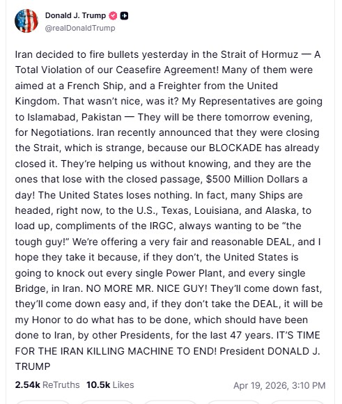 Σε ανάρτησή του στην πλατφόρμα Truth Social, ο Τραμπ υποστήριξε ότι οι ΗΠΑ προσφέρουν «δίκαιη συμφωνία», προειδοποιώντας ωστόσο πως σε περίπτωση αποτυχίας των συνομιλιών «θα καταστρέψουμε κάθε εργοστάσιο παραγωγής ενέργειας και κάθε γέφυρα στο Ιράν».