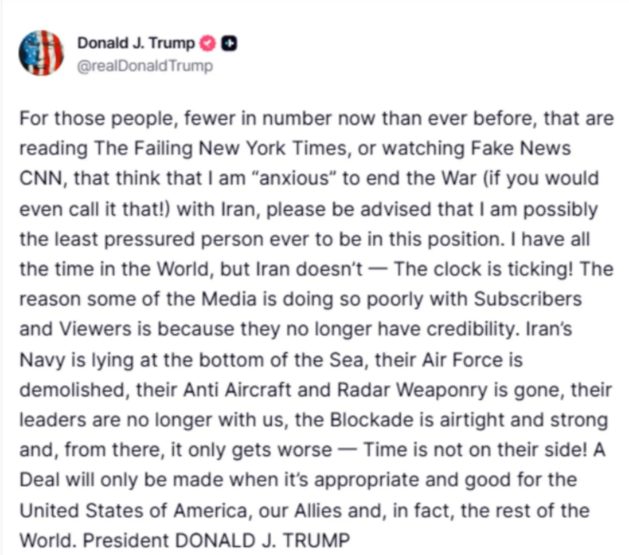 «Για εκείνους, που είναι πλέον λιγότεροι από ποτέ, που διαβάζουν την ‘αποτυχημένη’ New York Times ή παρακολουθούν το ‘Fake News’ CNN, και πιστεύουν ότι ‘ανυπομονώ’ να τερματίσω τον πόλεμο (αν μπορεί κανείς να τον ονομάσει έτσι!) με το Ιράν, σας ενημερώνω ότι είμαι ίσως το λιγότερο πιεσμένο άτομο που έχει βρεθεί ποτέ σε αυτή τη θέση. Έχω όλο τον χρόνο του κόσμου, αλλά το Ιράν δεν έχει — ο χρόνος τρέχει!