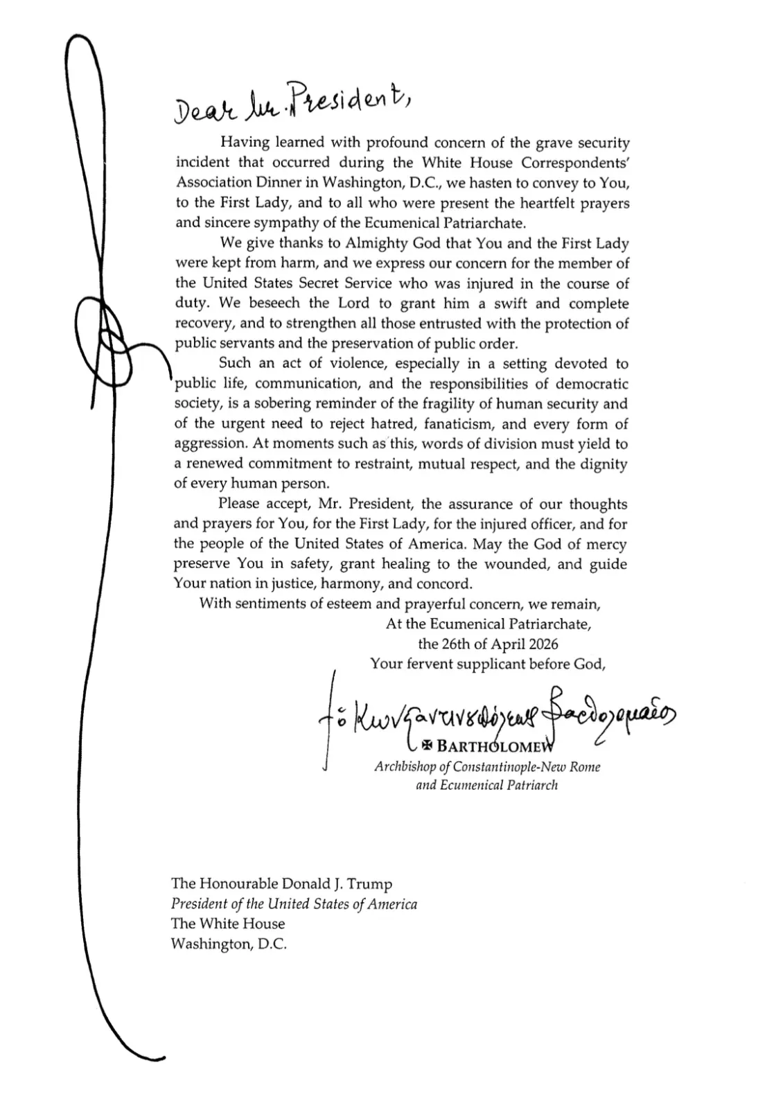 Επιστολή συμπαράστασης απέστειλε ο Οικουμενικός Πατριάρχης Βαρθολομαίος προς τον πρόεδρο των Ηνωμένων Πολιτειών Ντόναλντ Τραμπ, με αφορμή την επίθεση που σημειώθηκε κατά τη διάρκεια δείπνου της Ένωσης Ανταποκριτών του Λευκού Οίκου. Ο προκαθήμενος της Ορθόδοξης Εκκλησίας εξέφρασε την αλληλεγγύη του τόσο προς τον ίδιο όσο και προς τη σύζυγό του, Μελάνια Τραμπ, καθώς και προς όλους όσοι επηρεάστηκαν από το συμβάν.