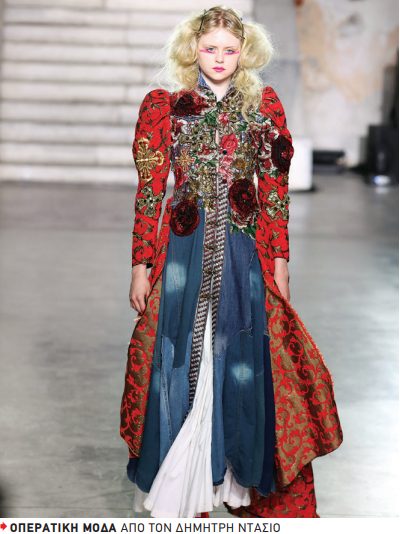 Αφροδίτη Χερά. Η σχεδιάστρια γνωρίζει όσο λίγοι να απελευθερώνει τις γυναίκες. Παρουσίασε και ανδρικά. Κυρίως εµπριµέ µε κίνηση, τζιν, κορσέδες µε αναγεννησιακές αναφορές, καφτάνια-αγκαλιά. Τα µοντέλα έµοιαζαν να χορεύουν, έτοιµα για µια χρωµατιστή επανάσταση. Μοτίβα σαν έργα τέχνης, ζωγραφικά ρεύµατα, µαξιµαλισµός, ένα µουσείο µέσα στο Καπνεργοστάσιο.