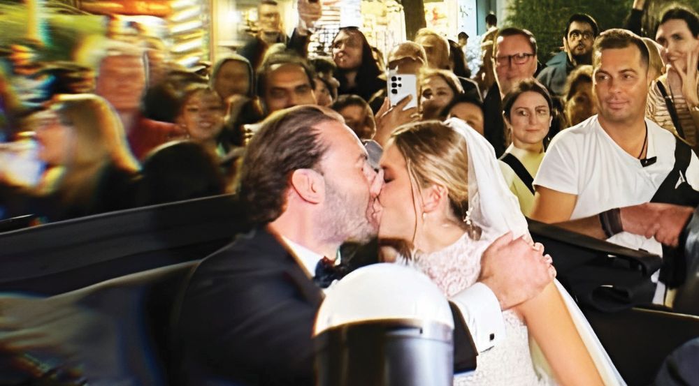 Tip: Η κίτρινη Ford -αντίκα από το 1923- που μετέφερε τους νεόνυμφους. Στολισμένη με λευκές κορδέλες και διακοσμημένη με ασορτί άσπρα λουλούδια, αντί πινακίδας είχε την επιγραφή «Just Married».