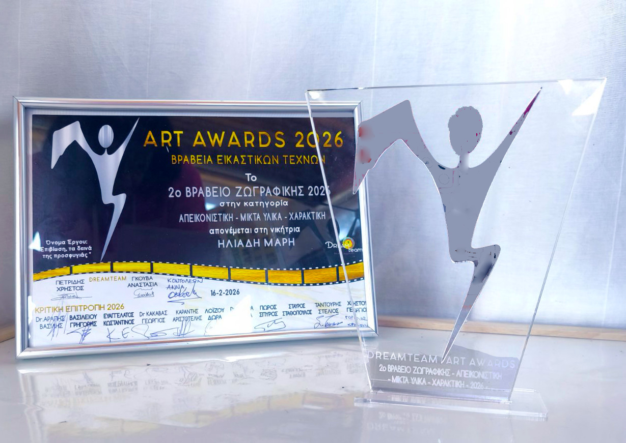 Η Μάρη Ηλιάδη απέσπασε το 2ο Βραβείο Ζωγραφικής στα Art Awards 2026, στο πλαίσιο της διοργάνωσης Dream Team #Love4Art#, η οποία τελεί υπό την αιγίδα του Υπουργείο Πολιτισμού Ελλάδας.