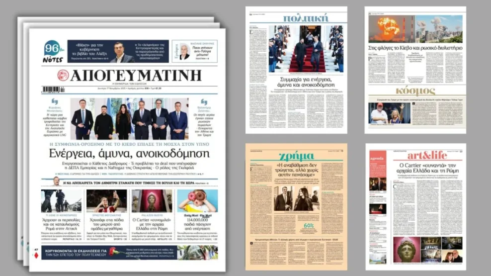 – Ενέργεια, άμυνα, ανοικοδόμηση – Η συμφωνία-ορόσημο με το Κίεβο έπιασε τη Μόσχα στον ύπνο – Ενεργοποιείται ο Κάθετος Διάδρομος – Τι προβλέπει το deal που υπέγραψαν η ΔΕΠΑ Εμπορίας και η Naftogaz της Ουκρανίας – Ο ρόλος της Γκιλφόιλ – Κυριάκος Μητσοτάκης: Η χώρα μας καθίσταται κόμβος τροφοδοσίας της Κεντρικής και της Ανατολικής Ευρώπης με αμερικανικό LNG – Βολοντίμιρ Ζελένσκι: Οι πηγές αερίου έγιναν στόχοι ρωσικών πυραύλων – Ευχαριστώ την Αθήνα και τον Τραμπ – Η θέση μας: Ο δρόμος για την Οδησσό – Μεν. Τασιόπουλος: Η διεθνής στρατηγική απελευθερώνει την εσωτερική πολιτική.