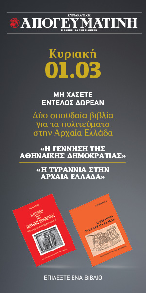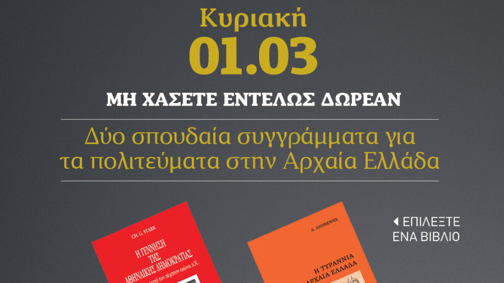 Η σπουδαία μελέτη παγκοσμίου κύρους του Chester Starr, «Η γέννηση της αθηναϊκής Δημοκρατίας» και το εξαιρετικά ενδιαφέρον σύγγραμμα του καθηγητή της Οξφόρδης Antony Andrewes, «Η τυραννία στην αρχαιά Ελλάδα», για να επιλέξετε, εντελώς δωρεάν, αποκλειστικά με την Κυριακάτικη Απογευματινή 1/3.